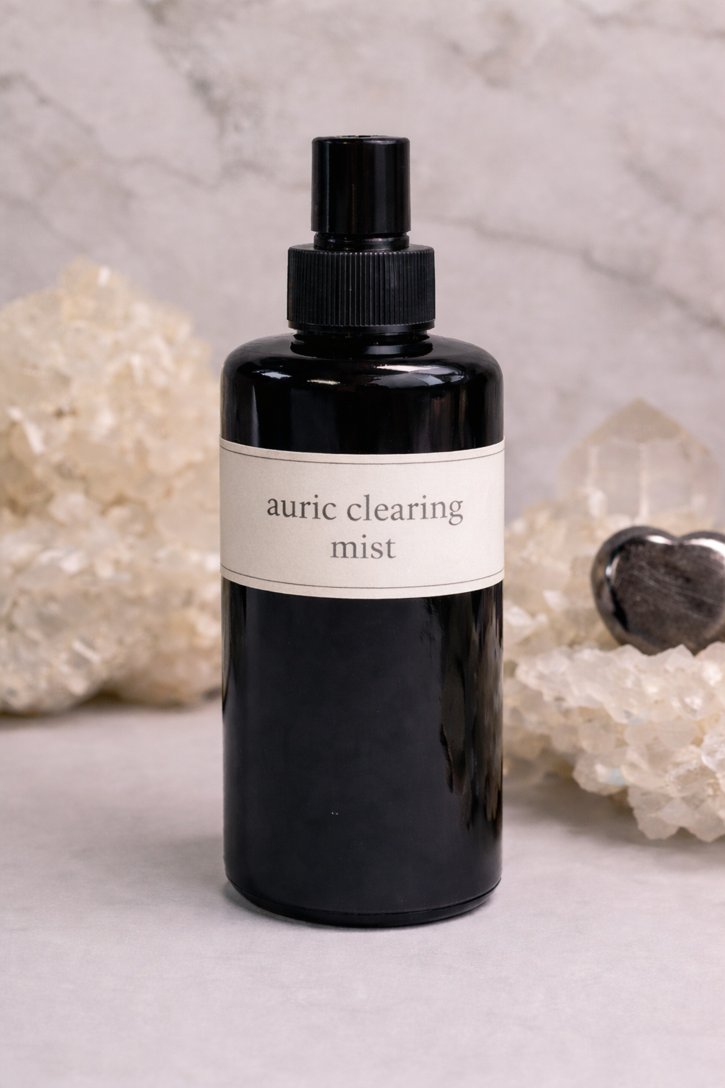 These space and auric clearing mists are created slowly and intentionally, blending essential oils, crystal infusion, and focused energetic work to gently harmonize the energetic field of both body and space.